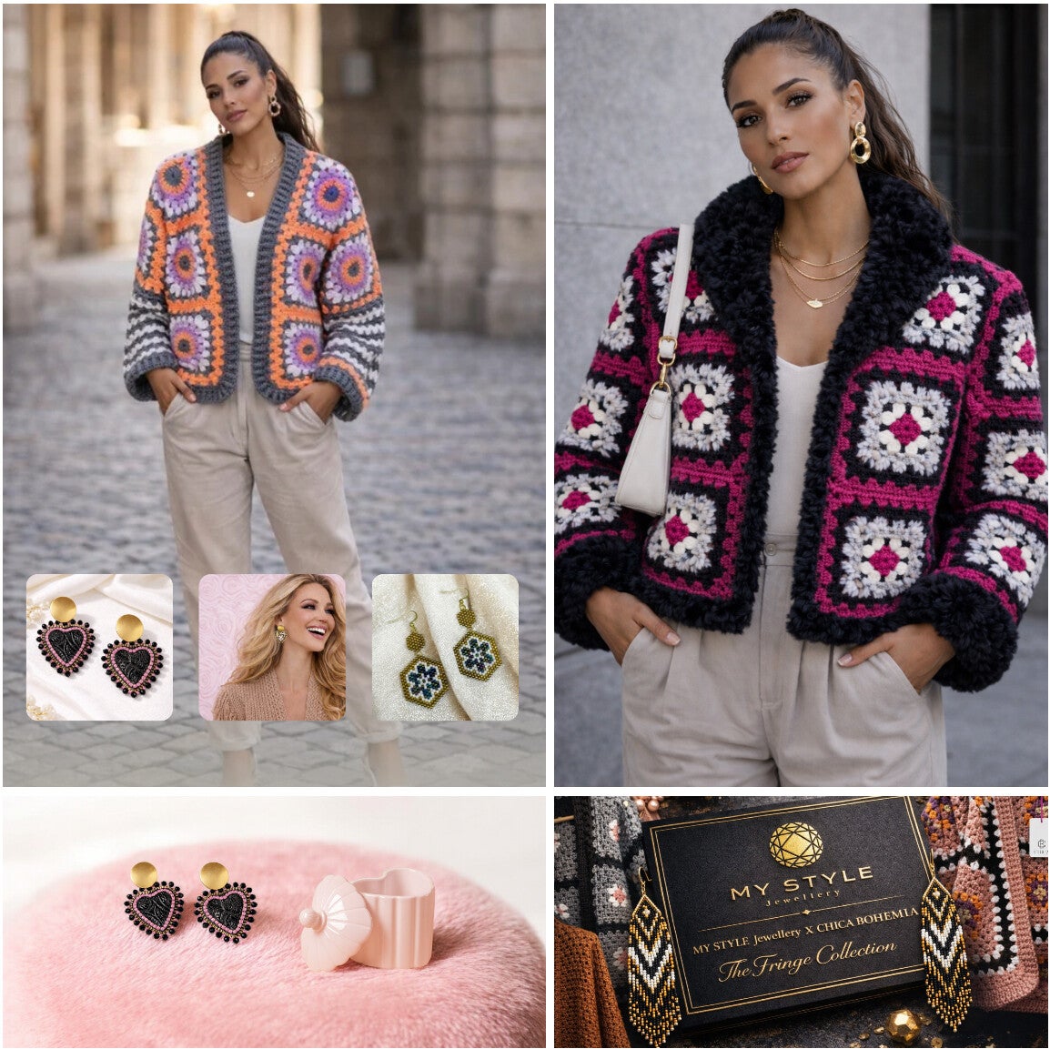Van decoratieve potten en Jewelry Jars, tot oorbellen, armbanden, ringen, tassen en gehaakte vesten. Alles met een warme, eigen uitstraling — een mix van Luxe, gezellig, speels en stijlvol.