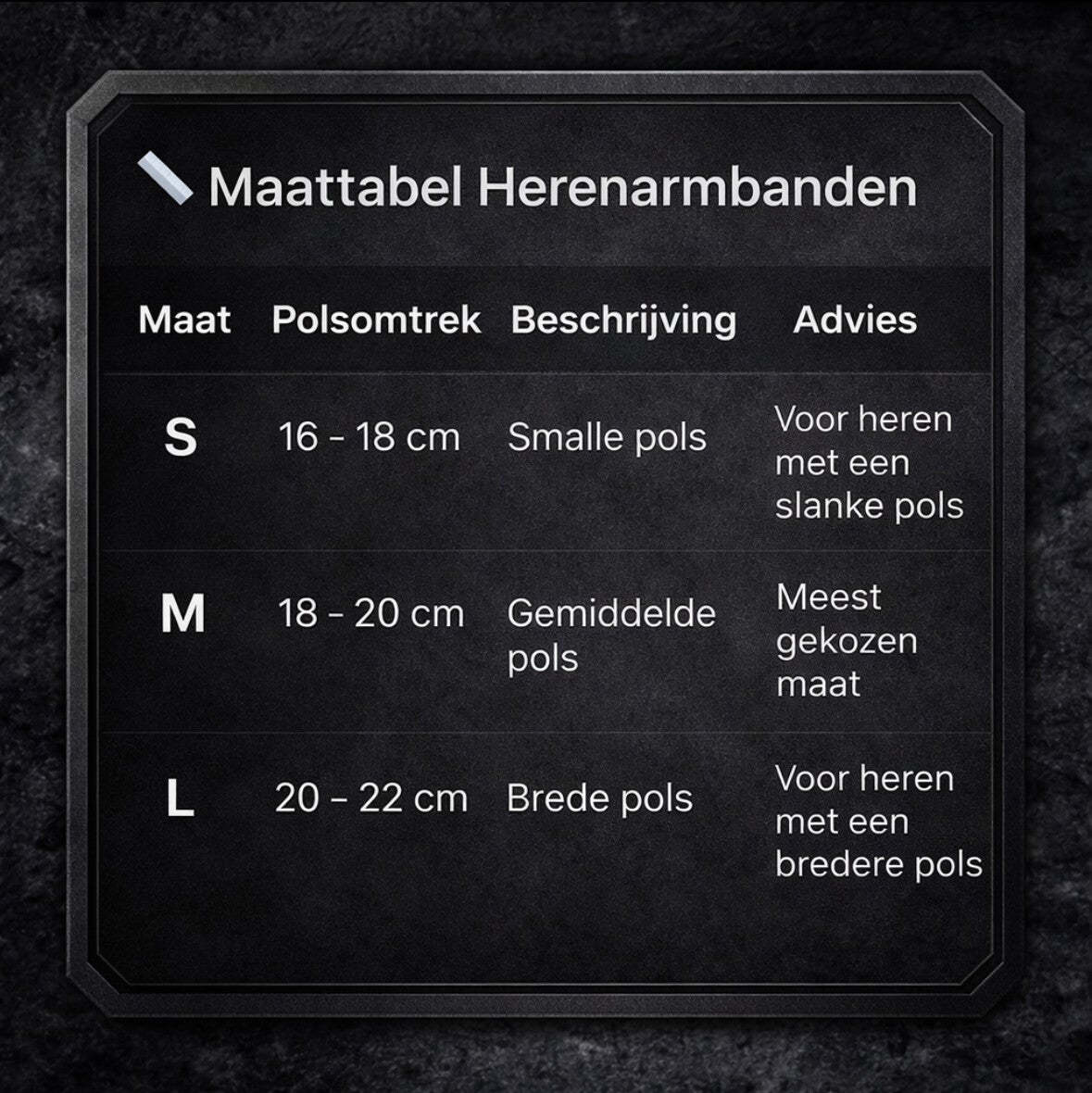 - Vergelijk de uitkomst met de maattabel hierboven.