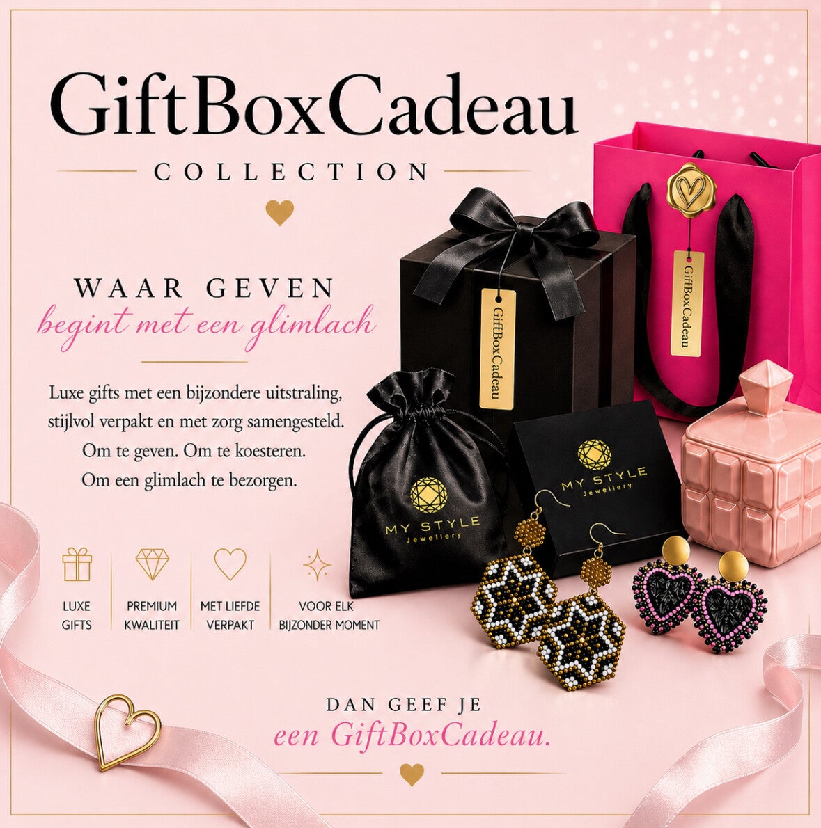 Elke giftbox wordt met zorg samengesteld, stijlvol verpakt en tot in detail afgewerkt. Premium sieraden, luxe accessoires en verfijnde items die direct een bijzondere indruk achterlaten.