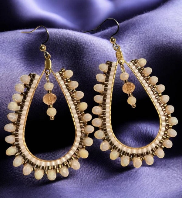 Statement oorbellen met creme parelmoer en goudkleurige glaskralen