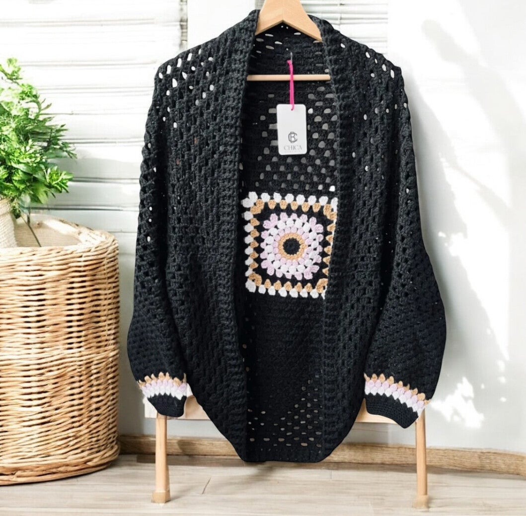 Gehaakt cocoon vest Mandala zwart
