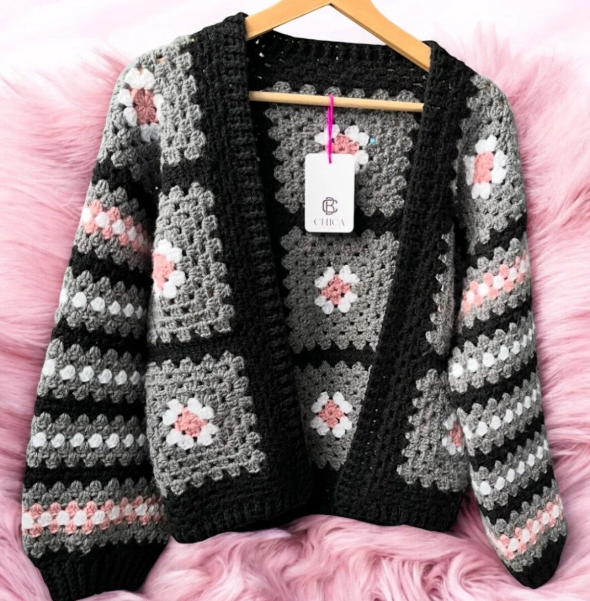 Granny Square vest meerkleurig zwart roze