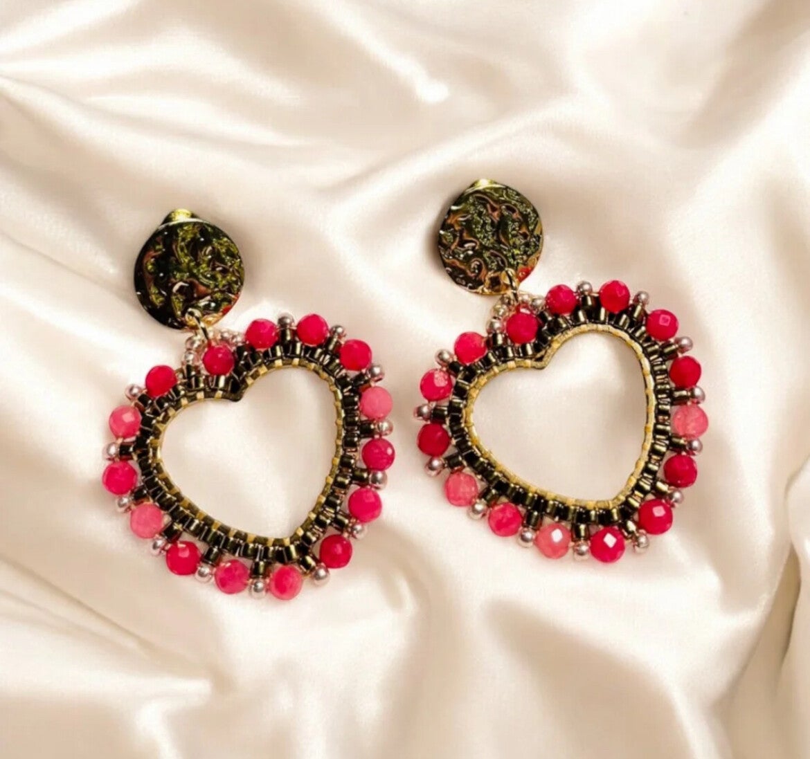 Materiaal: rozenrode kwarts 3 mm, goudkleurig roestvrij staal, Miyuki delica's, rocaille - Afmetingen: 3,5 cm x 3,0 cm