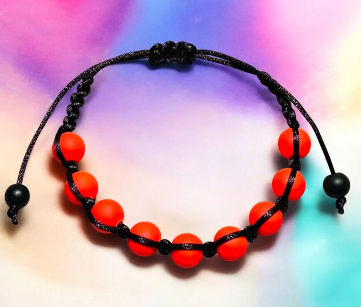 Materiaal: satijnkoord, 8 mm matte neon oranje acryl kralen, zwarte agaat natuursteen kralen