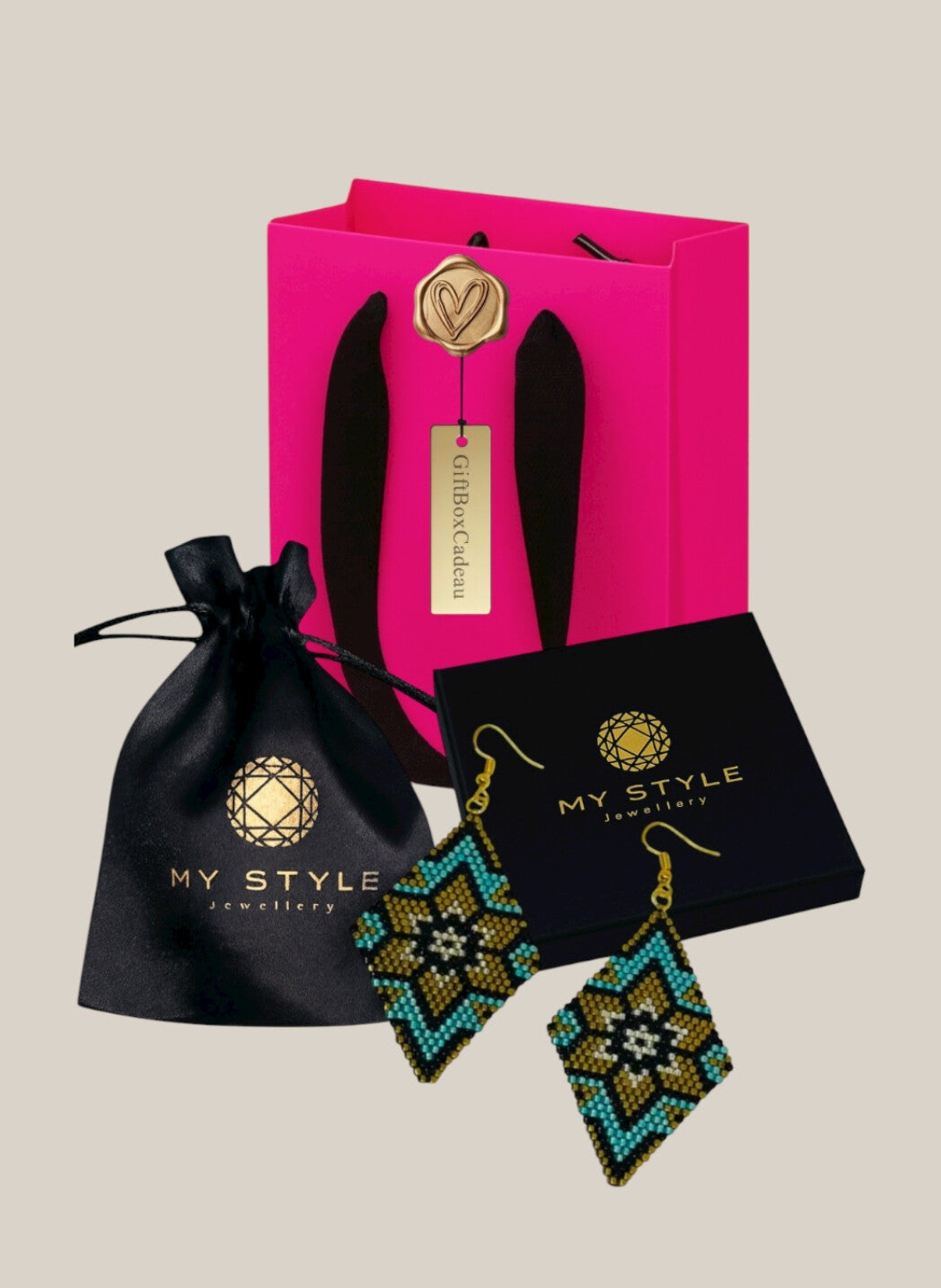 Deze oorbellen ademen elegantie en bohemian luxe. De combinatie van zeeblauw, zwart, wit en goud zorgt voor een stijlvolle balans tussen rust en kracht. Een uniek sieraad dat handgemaakt is met zorg en precisie.