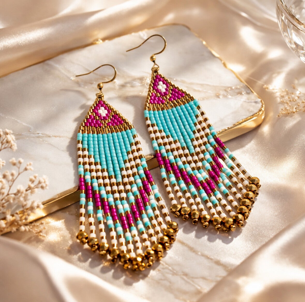 Deze stijlvolle Turquoise Bliss franje oorbellen combineren frisse turquoise tinten met levendige roze paarse accenten en warme goudtonen voor een elegante en opvallende uitstraling. Het verfijnde patroon, gemaakt met uniforme glaskralen, zorgt voor een luxe en moderne look. De vloeiende franje beweegt subtiel mee en geeft elke outfit een stijlvolle finishing touch.