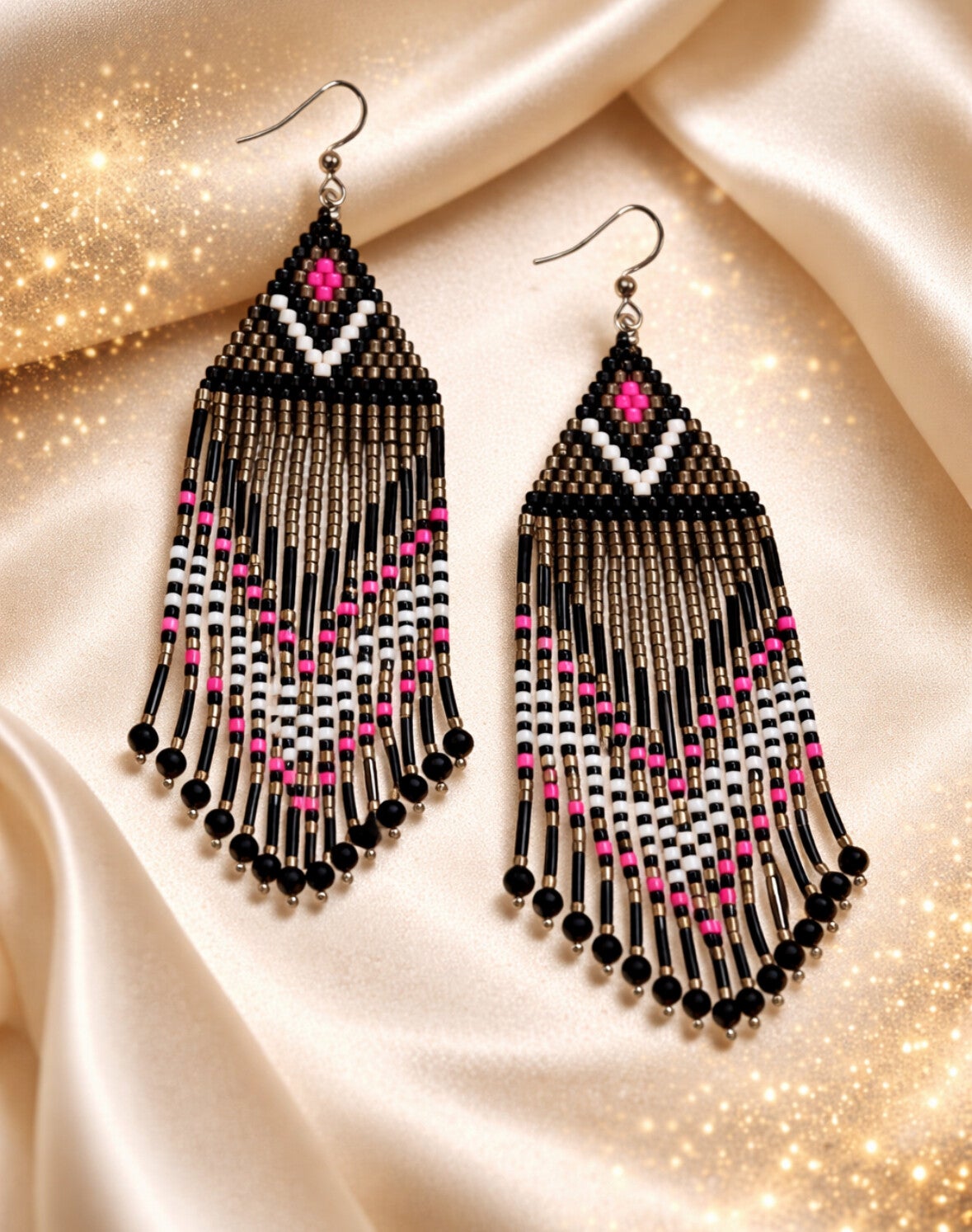 De Boho Mystic Pink oorbellen stralen een krachtige en mysterieuze bohemian vibe uit. Met de hand geweven Miyuki Delica kralen in zwart, fuchsia roze en zilverachtige tinten vormen een opvallend patroon dat elegant beweegt dankzij de lange franjes.