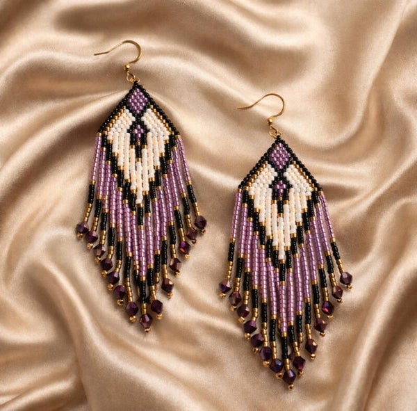 De Amethyst Spirit oorbellen combineren zachte paarse roze tinten met een mysterieuze bohemian uitstraling. De handgeweven Miyuki Delica kralen vormen een elegant patroon met speelse franjes die prachtig bewegen.