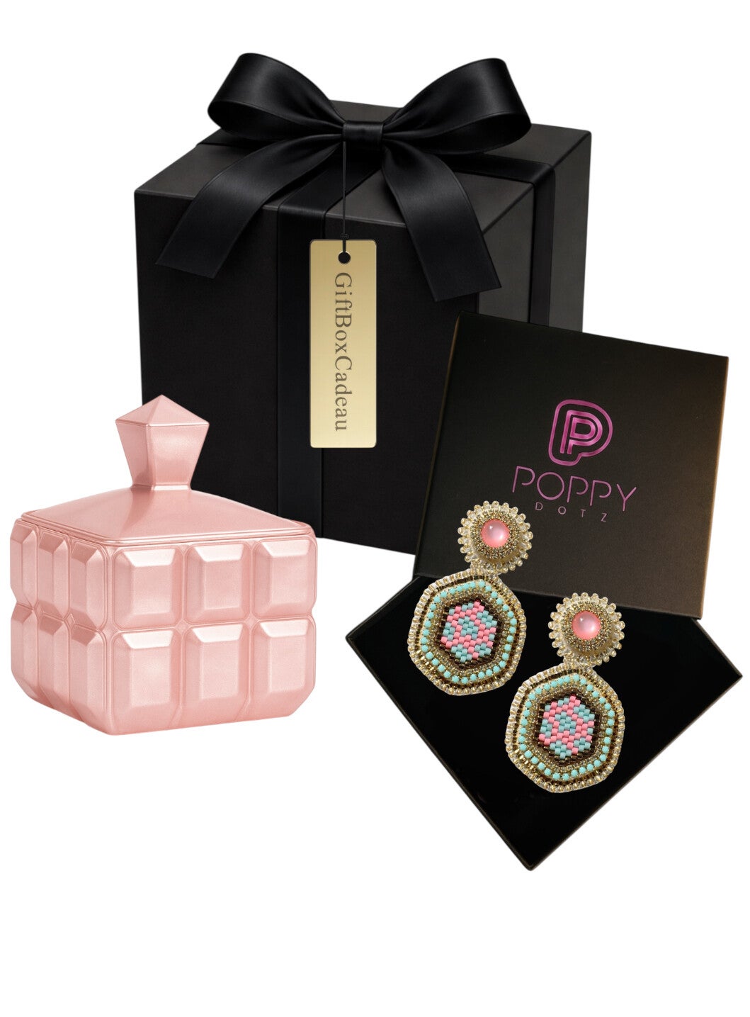 Deze schitterende set wordt geleverd met een luxe zwarte giftbox en een stijlvolle jewelry jar, perfect om je sieraden veilig en mooi te bewaren. Een prachtig cadeau voor jezelf of iemand die houdt van unieke handgemaakte sieraden.