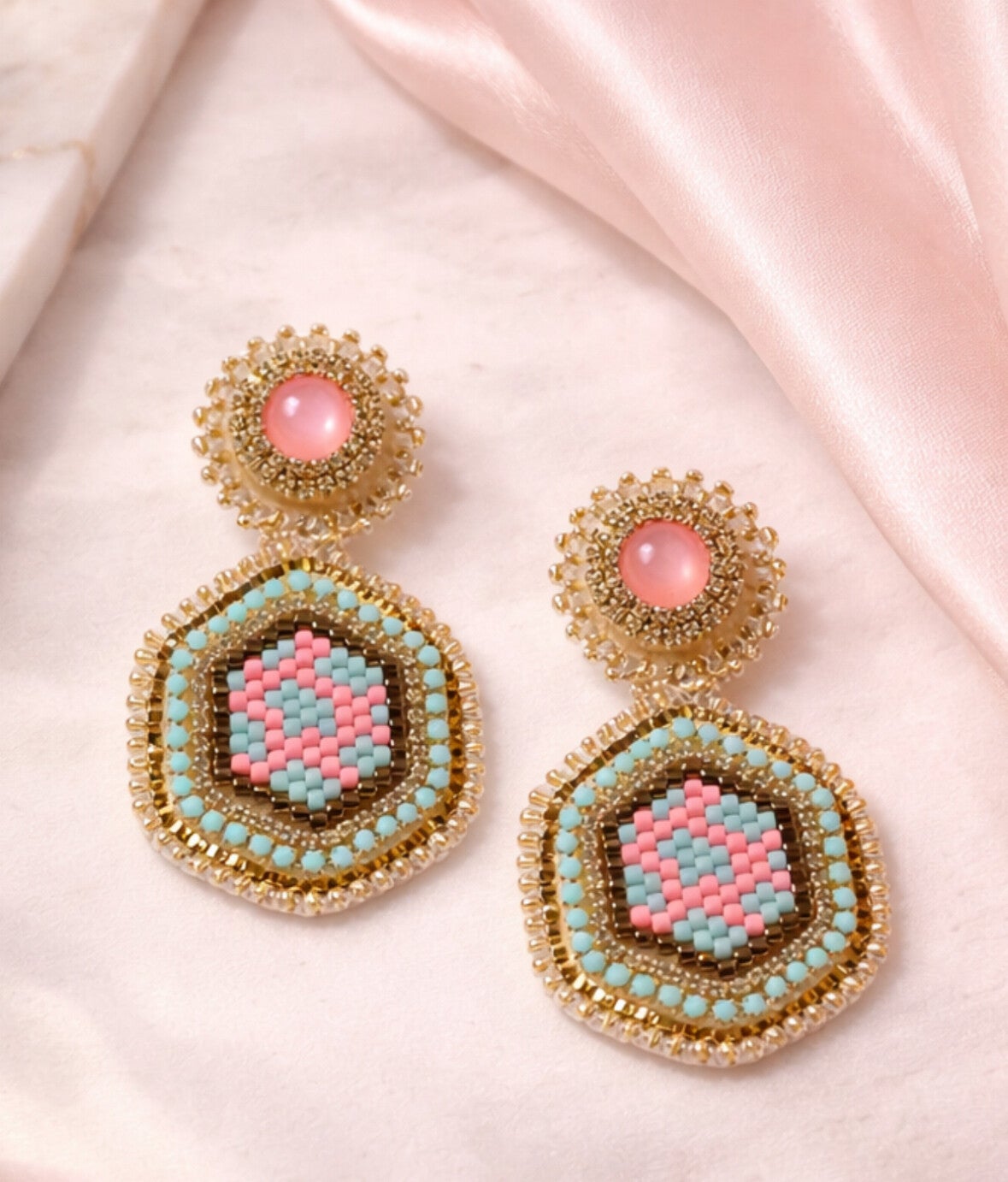 Deze Statement oorbellen giftset Pastel Royale straalt kleur, elegantie en bohemian luxe uit. De handgemaakte oorbellen combineren turquoise en zachte roze tinten met een verfijnd Miyuki design