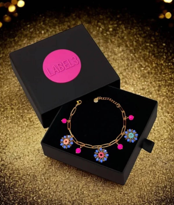 De Foira Lumière is een opvallende armband met kleurrijke bloemdetails die direct in het oog springen. De combinatie van goudkleurig RVS en speelse kleuren en handgemaakte bedels geven deze armband een frisse, luxe uitstraling.