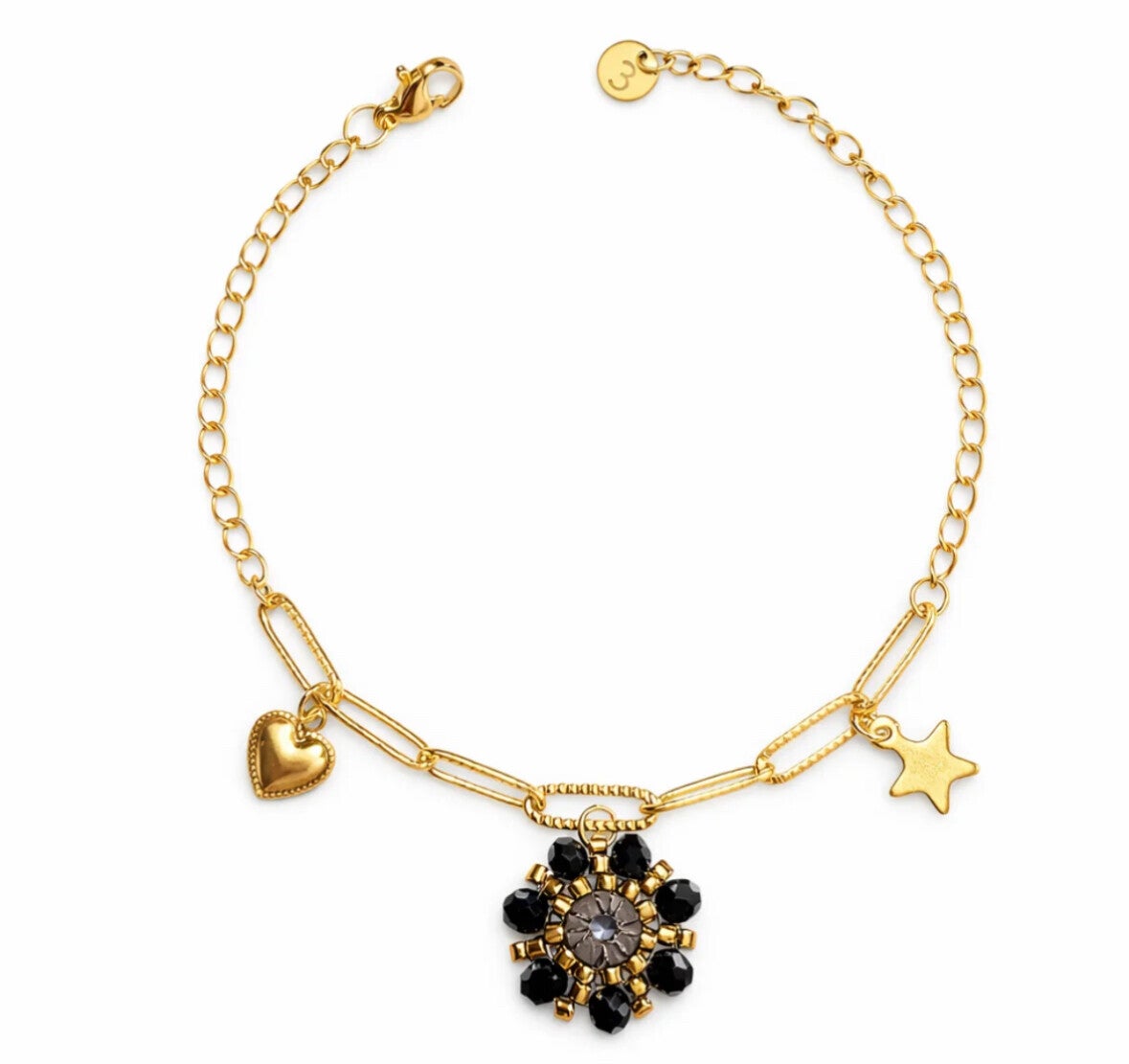 Deze elegante armband van roestvrij staal is een echte eyecatcher. Het verfijnde gouden design wordt verrijkt met een opvallende bloemhanger van glaskralen in zwart en goudtinten, gecombineerd met speelse bedels in de vorm van een hart en een ster. Dankzij het tijdloze ontwerp is deze armband perfect om solo te dragen of te combineren met andere sieraden. Duurzaam, stijlvol en geschikt voor elke gelegenheid.