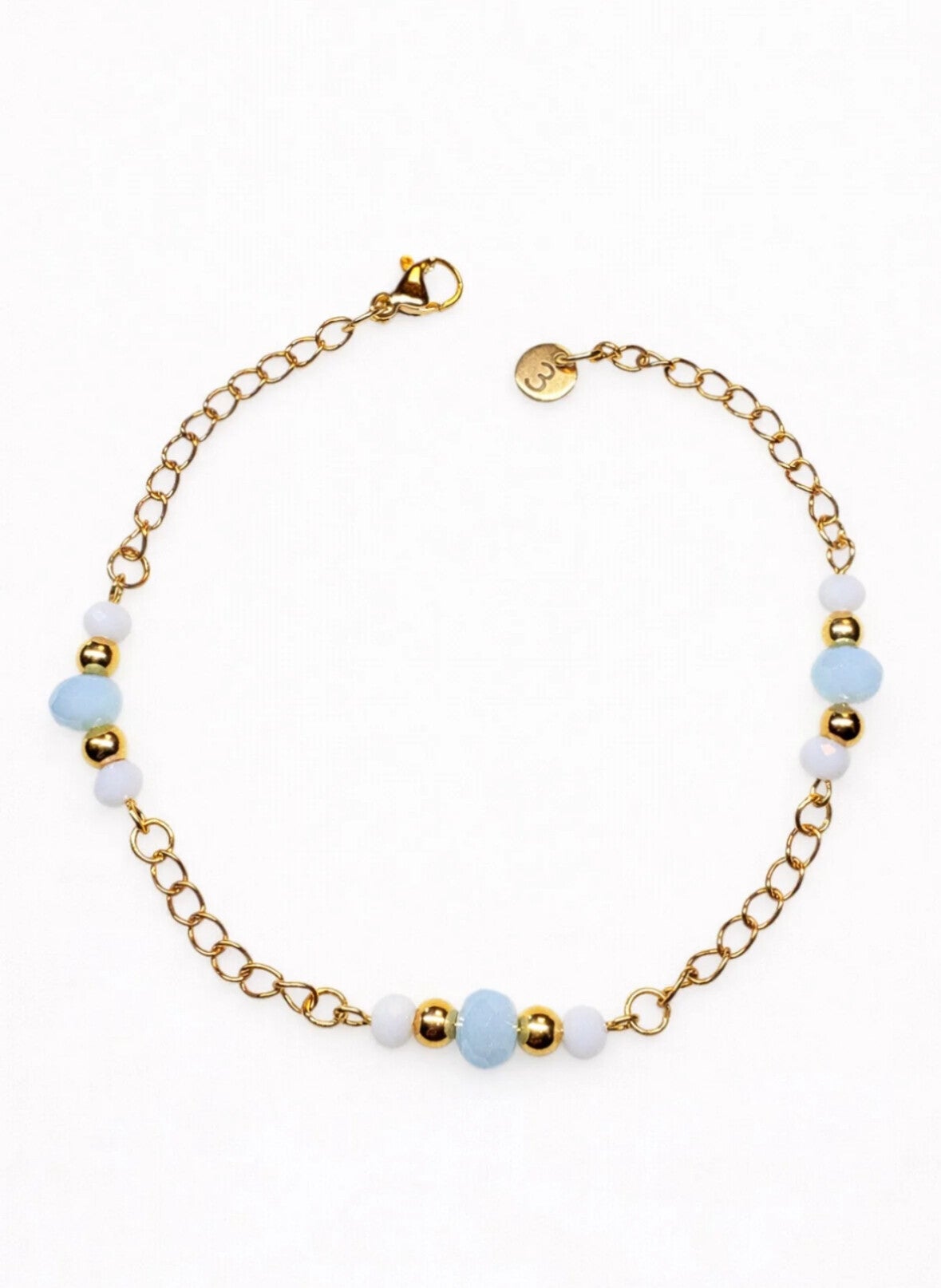 Elegante schakelarmband met zachtblauwe en witte glaskralen. De subtiele kleuren en fijne schakels geven dit sieraad een frisse, rustige uitstraling — perfect voor minimalistische stijlen.