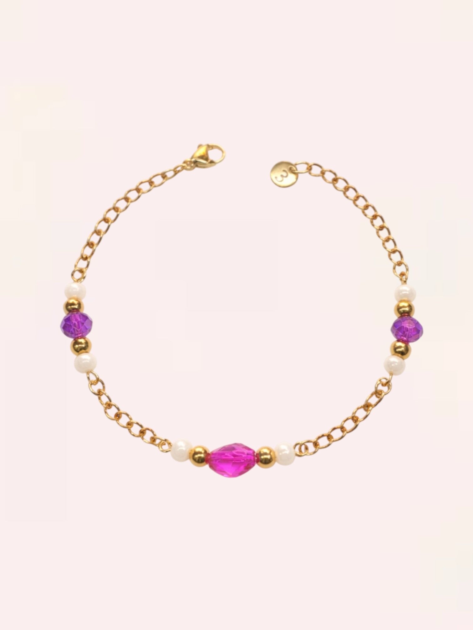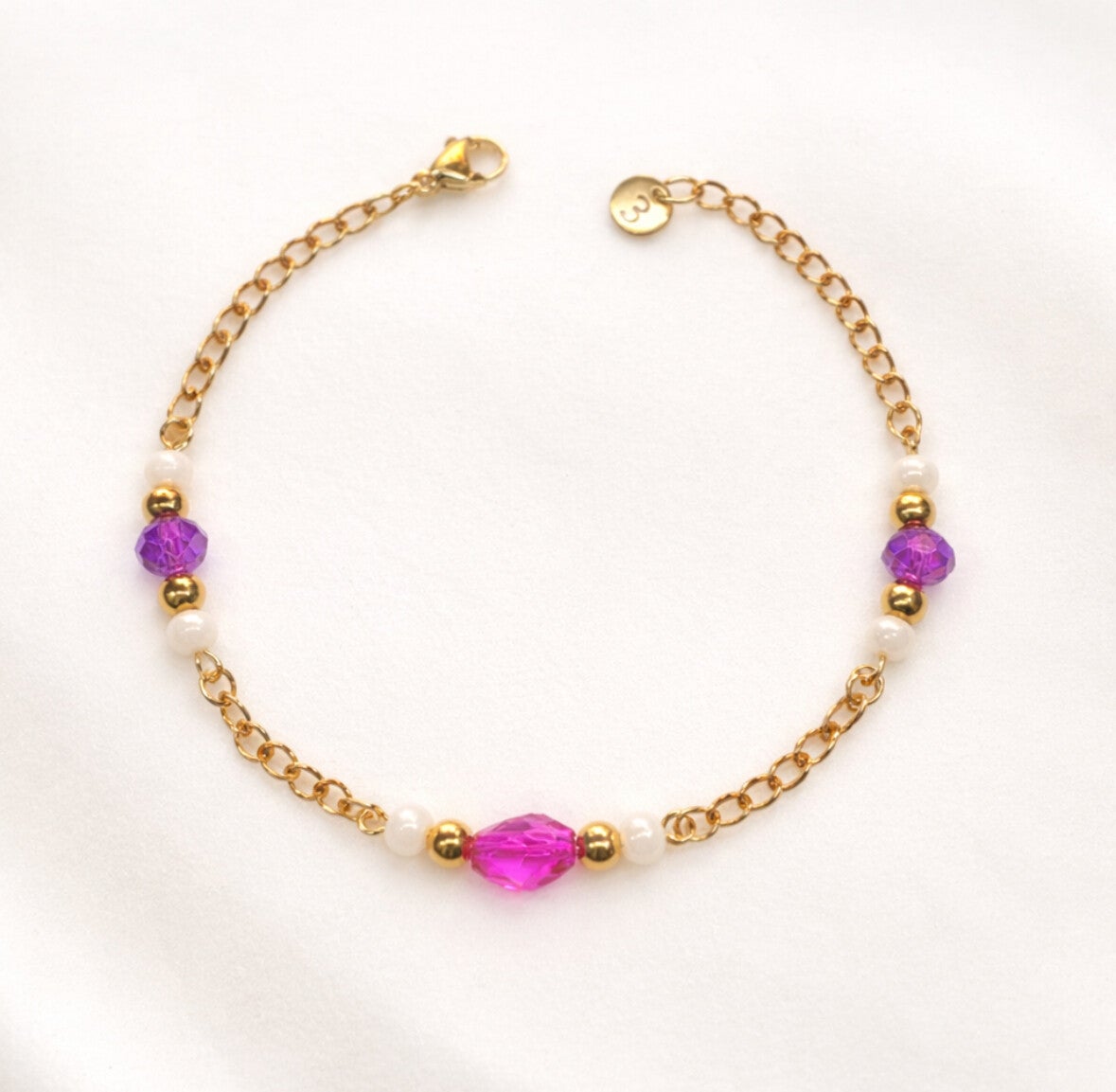 Een stijlvolle RVS armband met roze en paarse glaskralen voor een zachte maar opvallende kleurcombinatie. Een elegante toevoeging aan je dagelijkse sieraden.