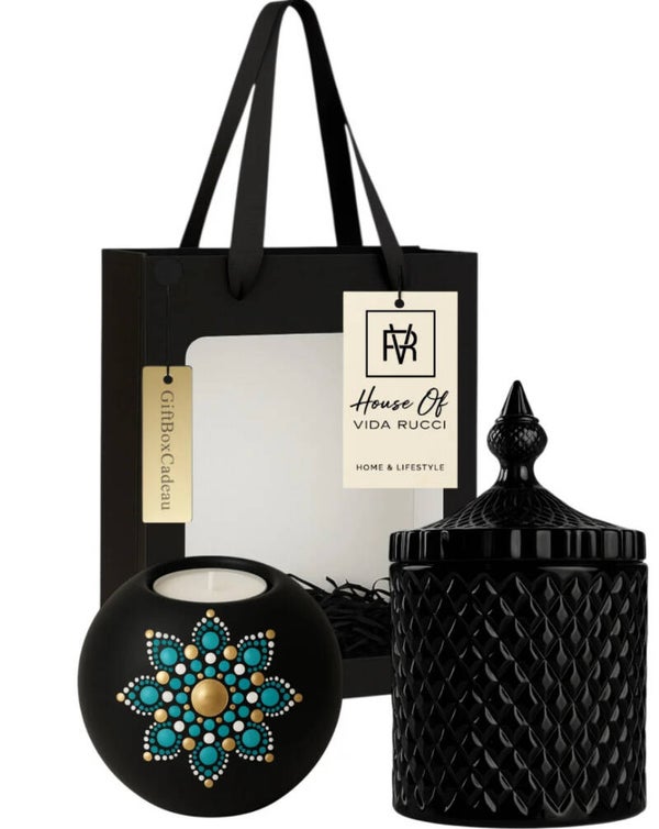 De Gold Eleganza Turquoise Gift Set straalt karakter en verfijning uit, met een handgeschilderd dot art mandala patroon dat dot voor dot ontstaat.