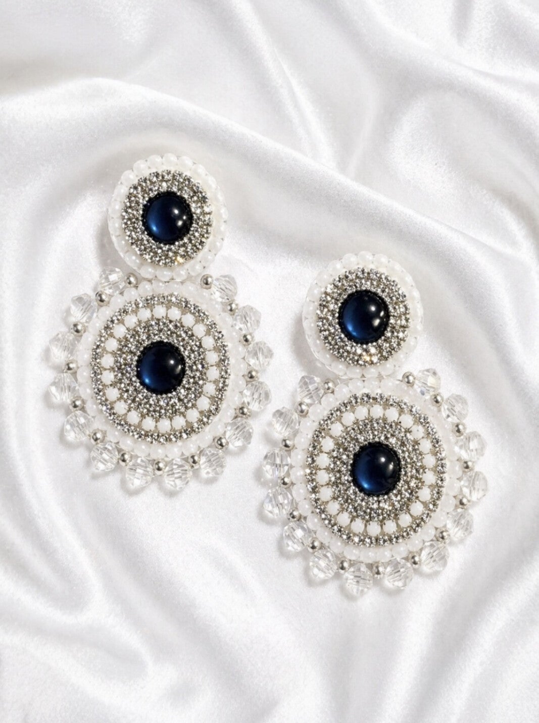 Nuit Royale straalt pure elegantie en luxe uit. Deze handgemaakte statement oorbellen combineren diep navyblauwe details met fonkelende strass, kristalaccenten en een verfijnde witte basis voor een chique en exclusieve uitstraling. De ronde vorm en luxe afwerking maken deze oorbellen perfect voor gala’s, diners, bruiloften en stijlvolle avondlooks.